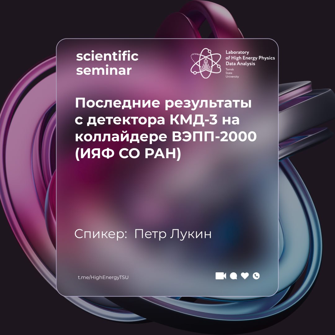 9 октября, в четверг, в 17:00 по Томску в рамках семинара Лаборатории анализа данных физики высоких энергий состоится доклад на тему: «Последние результаты с детектора КМД-3 на коллайдере ВЭПП-2000 (ИЯФ СО РАН)».